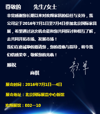 BIFF·2016北京國際家具展將于7月1-4日在北京市順義區(qū)中國國際展覽中心新館盛大開幕,家具湘軍—歡顏家居參展,誠邀各位蒞臨。